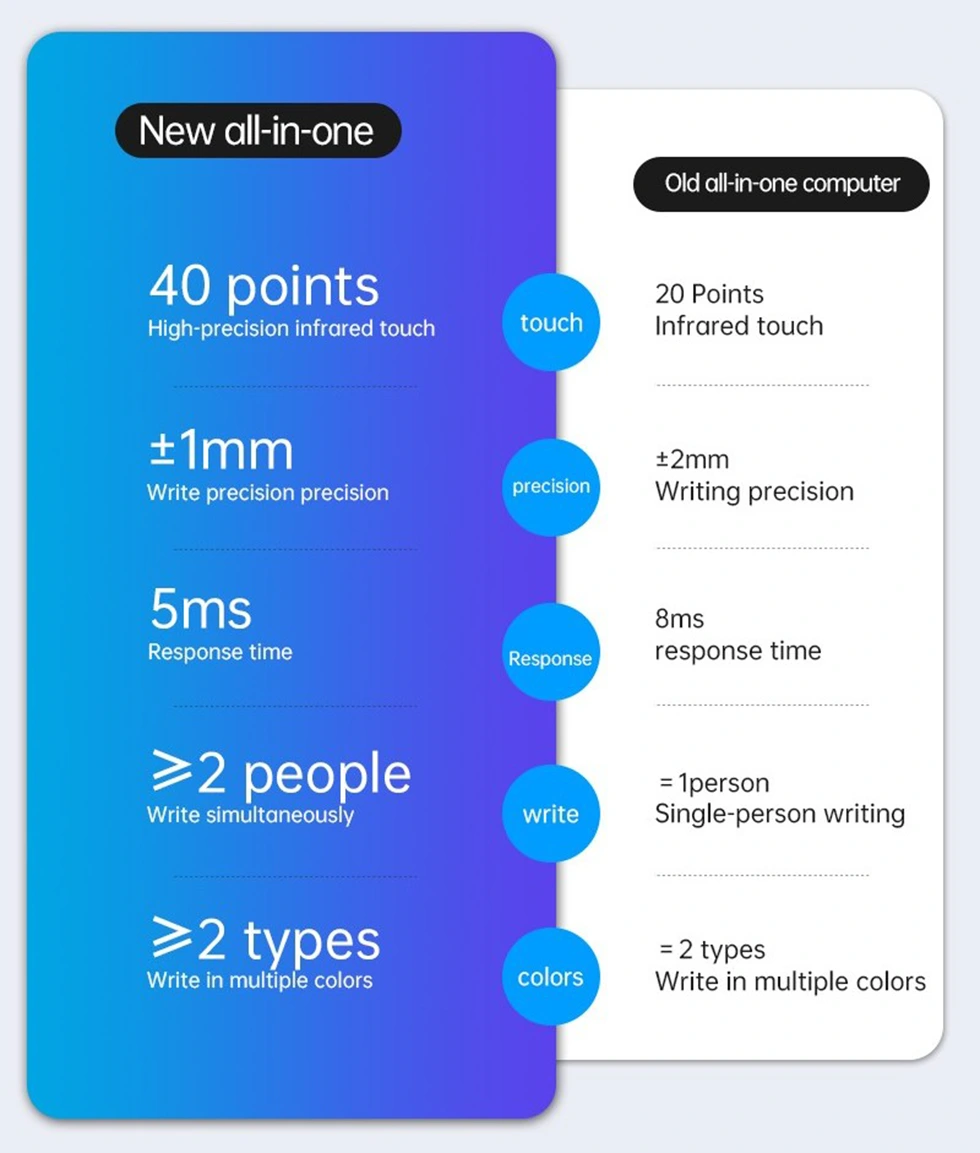 Pokročilá infračervená dotyková technologie podporuje bezproblémovou spolupráci s vysoce citlivou a přesnou dotykovou interakcí. Podporuje spolupráci více uživatelů se 40 dotykovými body a intuitivním ovládáním gesty pro zoomování a navigaci. Technologie také nabízí přizpůsobitelné nastavení pera a rozšiřitelný pracovní prostor pro přizpůsobení různým profesionálním potřebám.