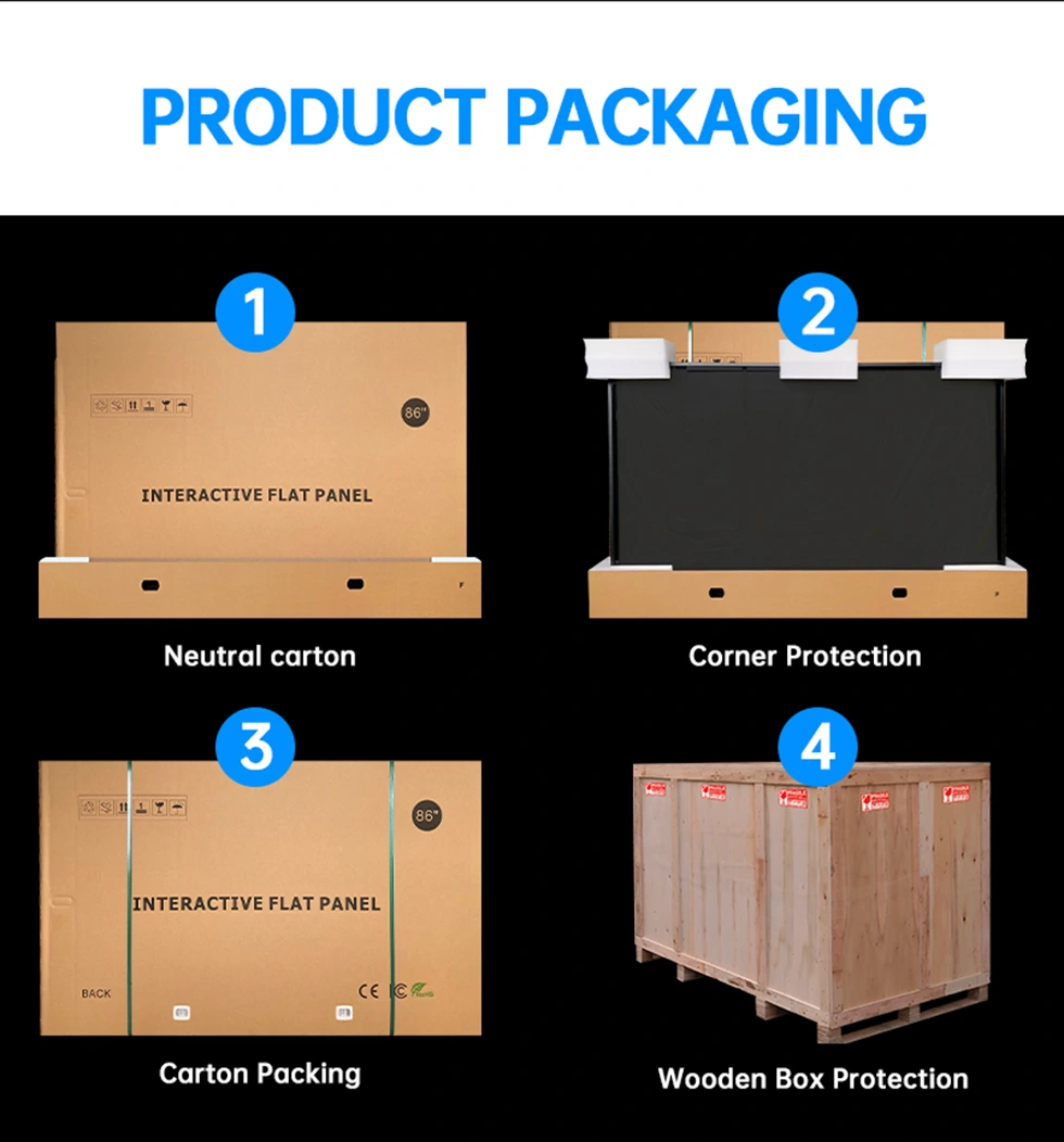 Interaktivní displej je bezpečně zabalen v neutrálním kartonu se zesílenou dřevěnou ochranou krabice pro bezpečnou přepravu.